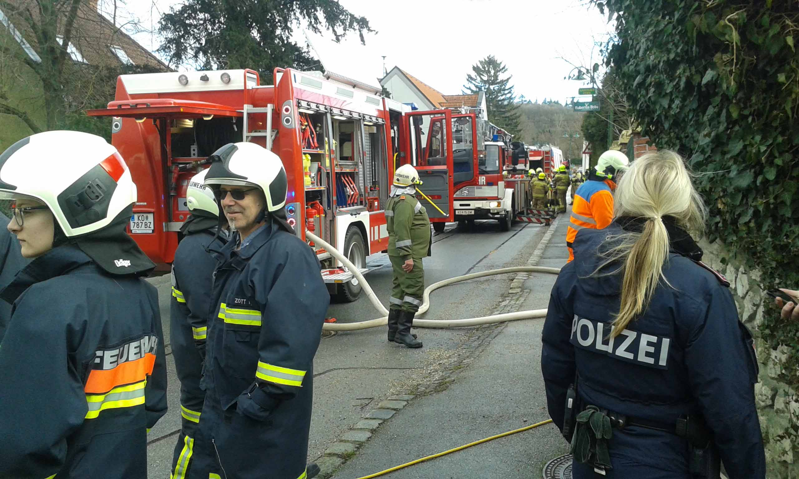 Am Einsatzort angekommen unterstützen wir die bereits vor Ort anwesenden Feuerwehren bei den Löscharbeiten. Um das Feuer optimal bekämpfen zu können, wurde die Drehleiter der Freiwilligen Feuerwehr der Stadt Korneuburg angefordert.