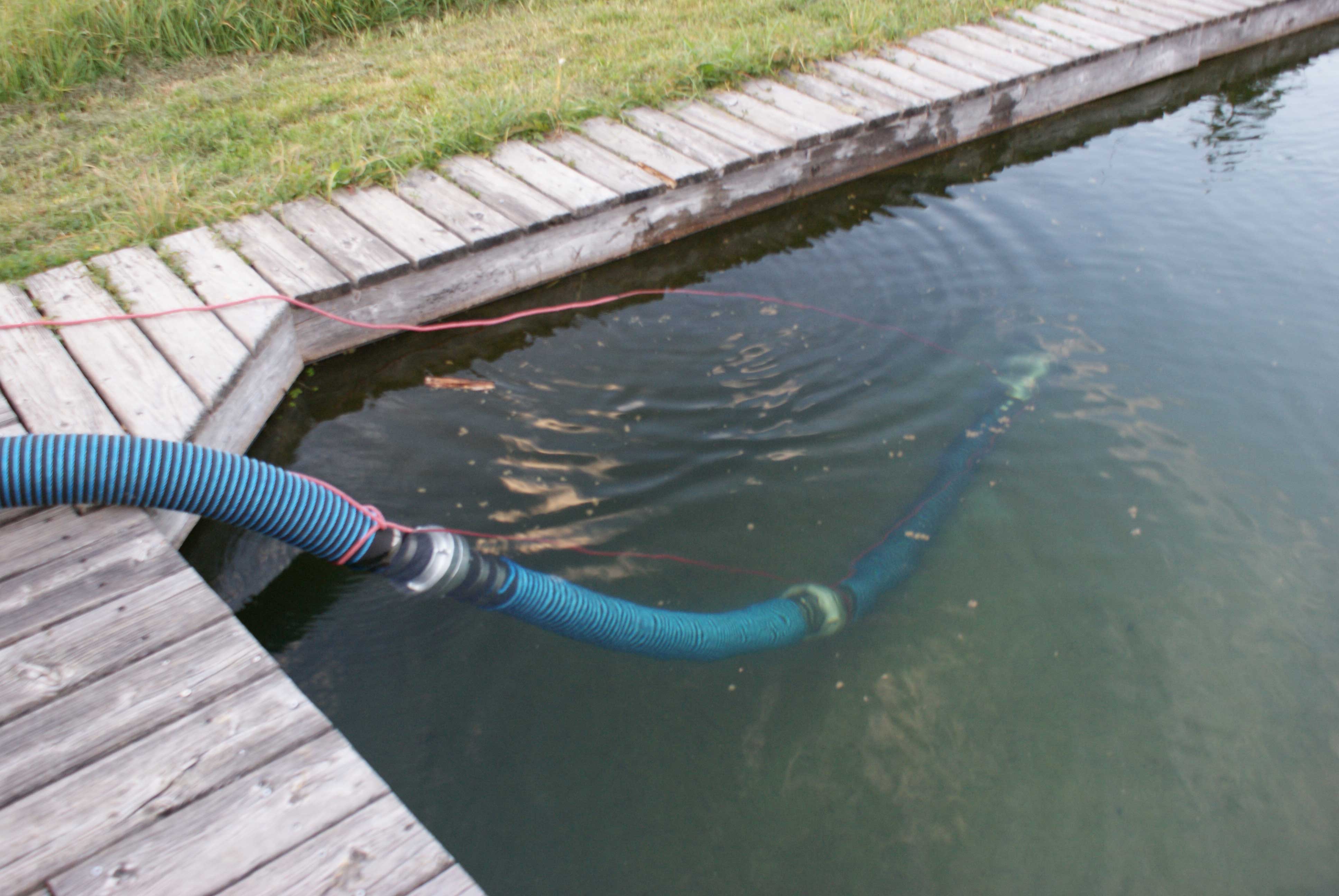 Bei der praktischen Umsetzung wurde mittels Tragkraftspritze (TS) über eine von den Kindern erstellte Saugleitung, bestehend aus 4 Saugern, im Teich angesaugt. Der „Angriff“ erfolgte anschließend mittels aufgebauter Löschleitung mit einem C-Mehrzweckstrahlrohr. Die Kinder konnten abwechselnd zu zweit mit Unterstützung der Feuerwehrjugendbetreuer das Strahlrohr bedienen.