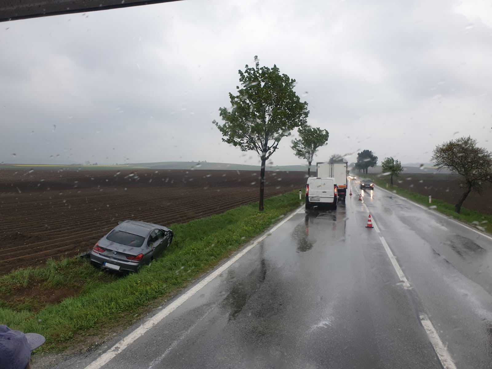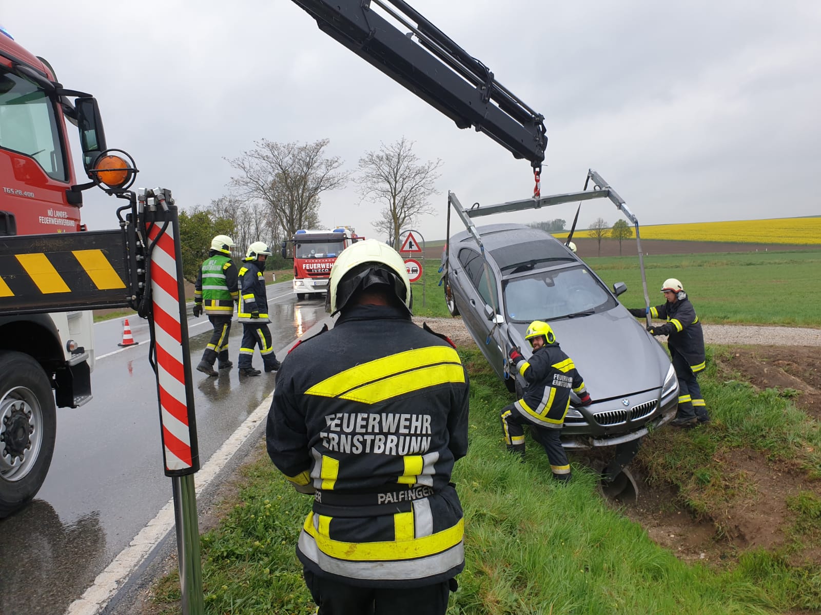 Zwei Fahrzeuge sind bei einem Überholvorgang zusammen gestoßen. Verletzt wurde dabei niemand. Unsere Aufgabe war es die Unfallstelle abzusichern und den weißen PKW von der Fahrbahn zu entfernen. Das zweite Fahrzeug wurde von der Feuerwehr Ernstbrunn mit dem Wechselladerfahrzeug mittels Ladekran aus dem Graben gehoben.