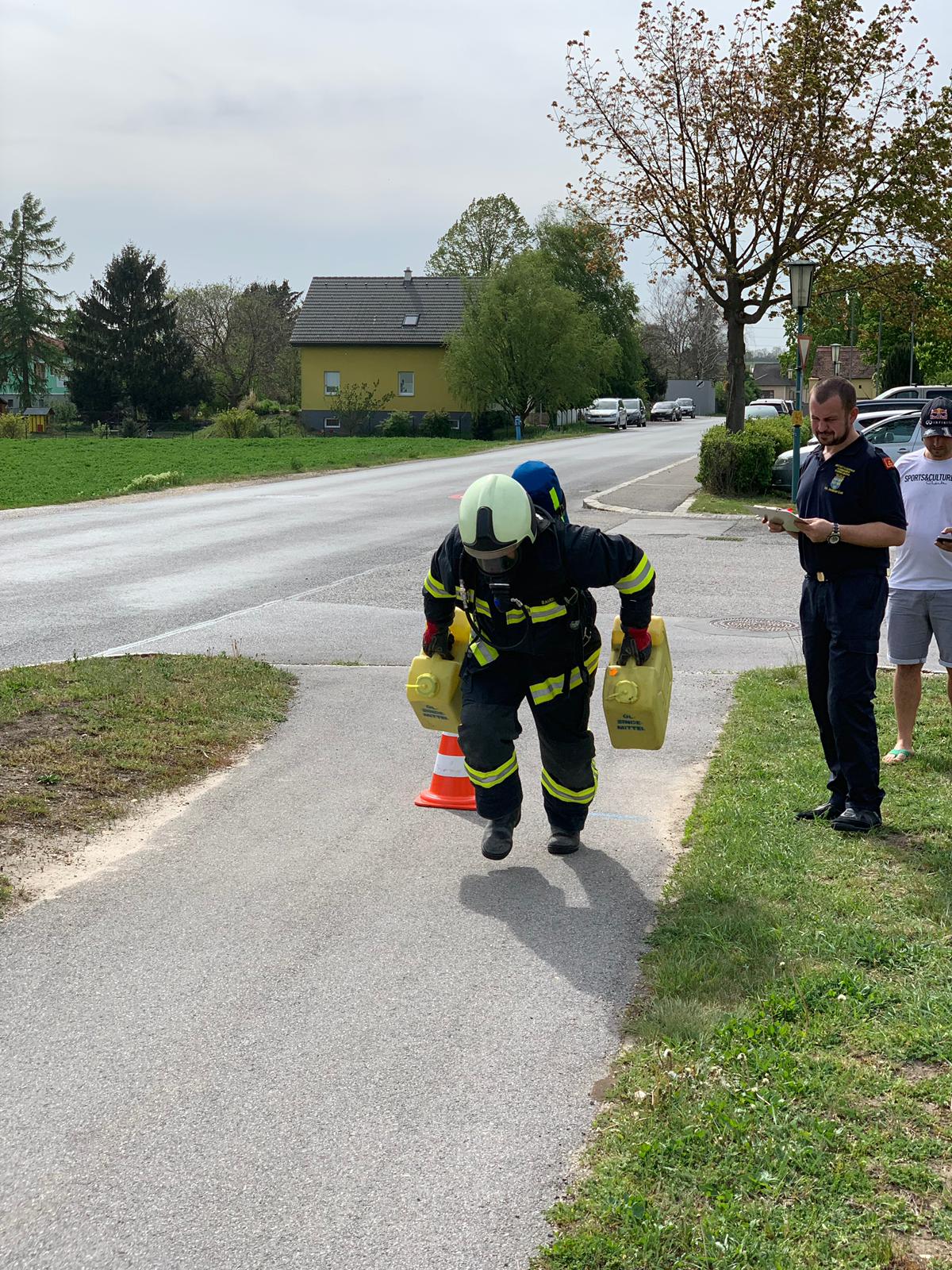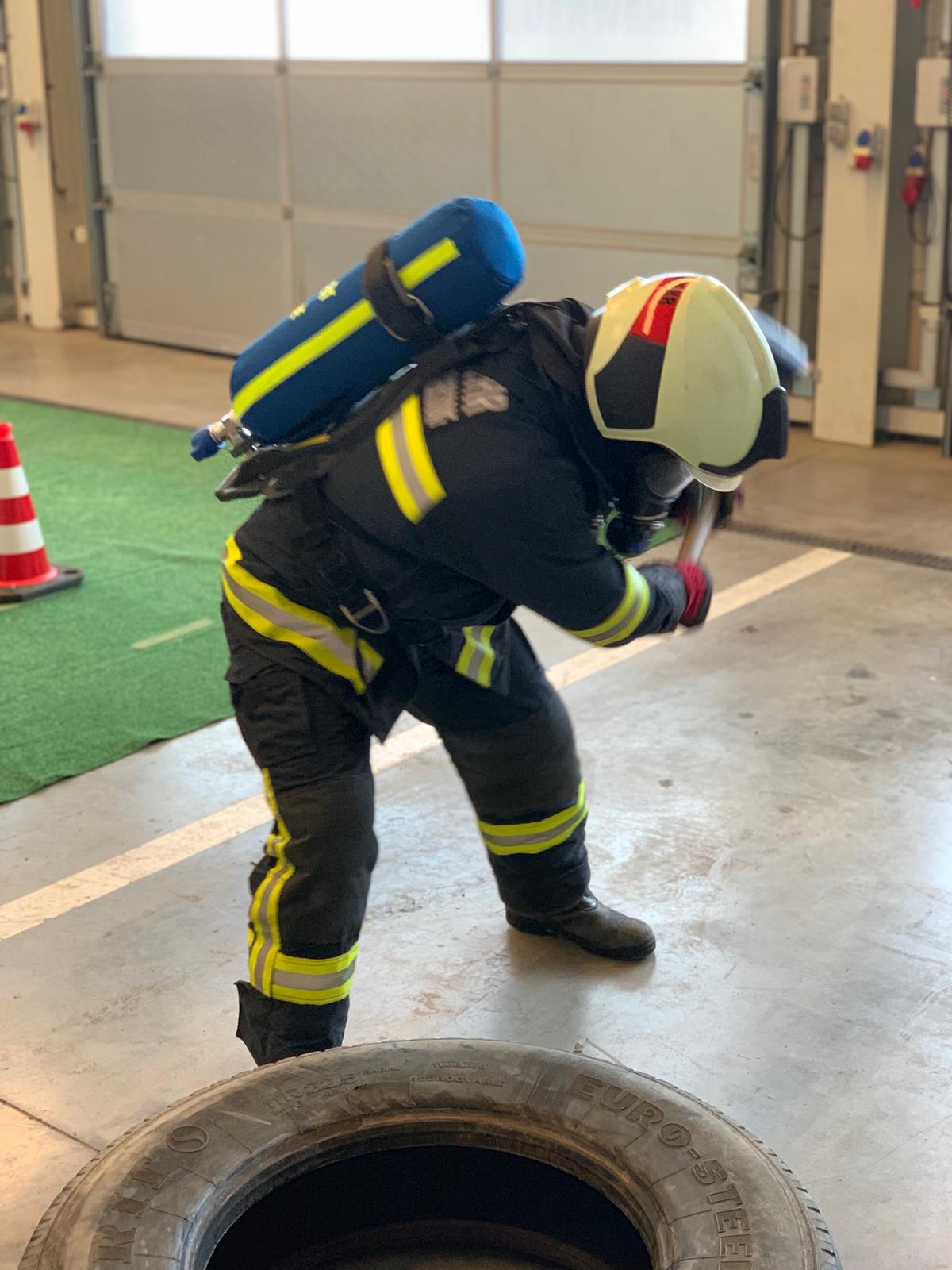 Beim Finnentest wird die Belastungsfähigkeit des Atemschutzträgers an fünf Stationen genau unter die Lupe genommen. Bei den Stationsaufgaben "Tragen eines Kanisters", "Stiegensteigen", "Bewältigung eines Hindernisparcours", "Hammerschlagen" und "Zusammenrollen eines C-Schlauchs", mit schwerer Atemschutzausrüstung am Körper, bewiesen die Kandidaten ihr Können.