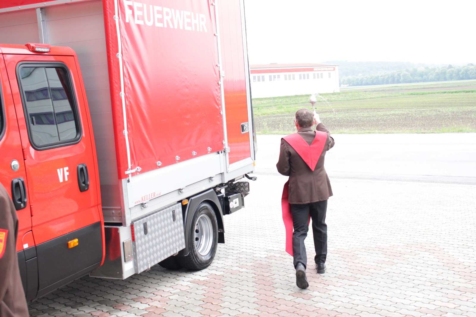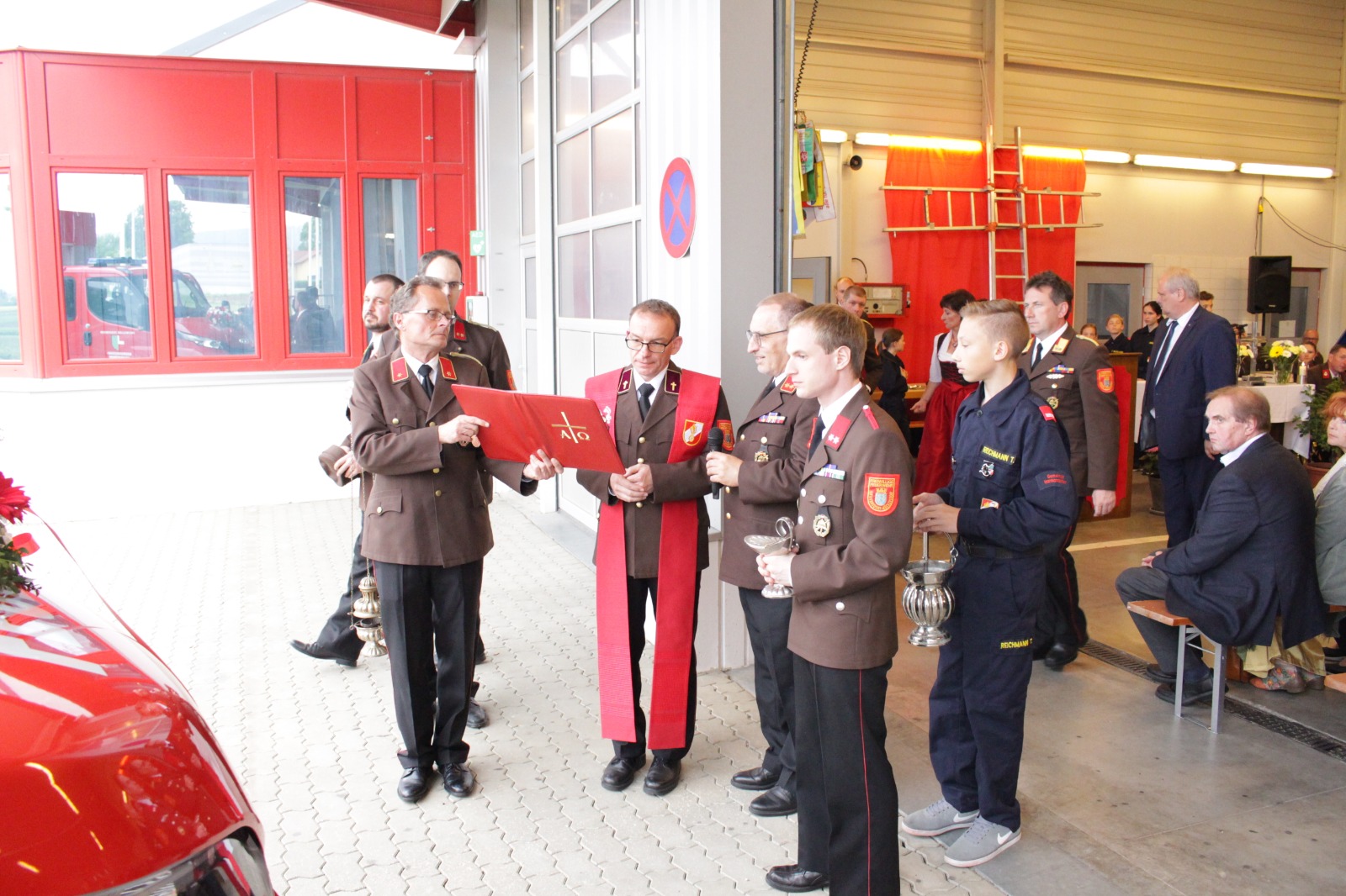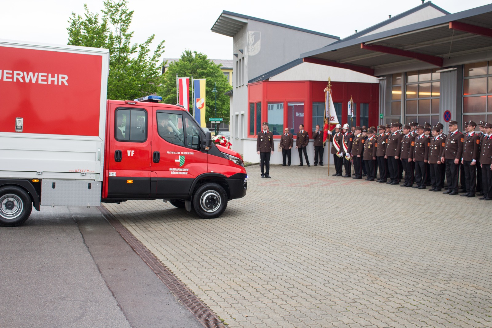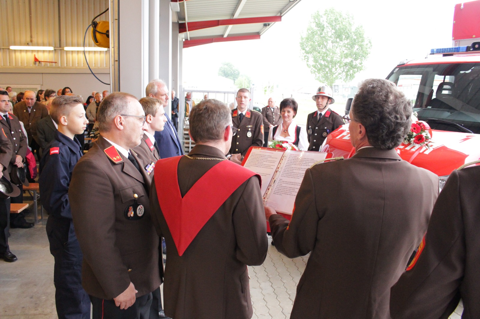 Gegenüber der ursprünglichen Planung wurde die hl. Messe aufgrund der Witterung von der Pfarrkirche Harmannsdorf in das Feuerwehrhaus verlegt. Vor der hl. Messe, wurde die Fahrzeugpatin, Frau Brigitte Hirsch, von unserem Feuerwehrkommando mit dem neuen Fahrzeug von zu Hause abgeholt. An dieser Stelle bedankt sich die Freiwillige Feuerwehr Harmannsdorf nochmals recht herzlich für die Übernahme der Patenschaft. Darüber hinaus bedankt sich die Freiwillige Feuerwehr Harmannsdorf-Rückersdorf auch noch bei allen Unterstützerinnen und Unterstützern, welche die Anschaffung des neuen Fahrzeuges überhaupt erst möglich gemacht haben.