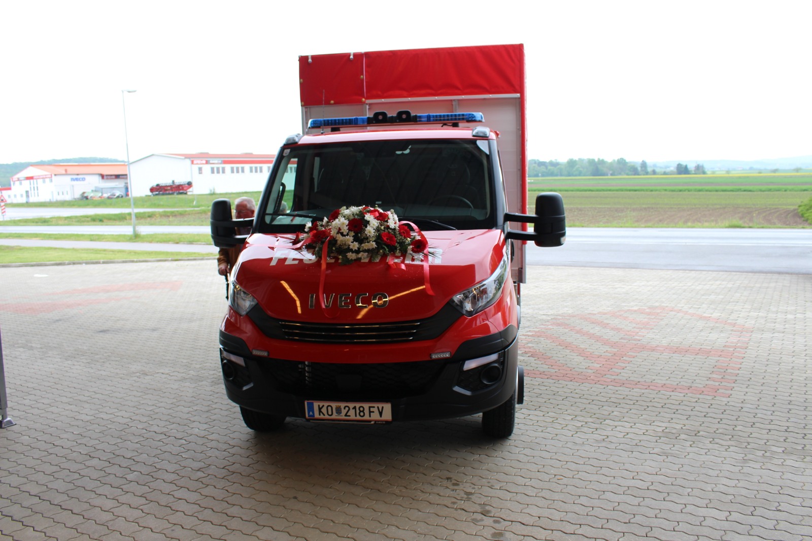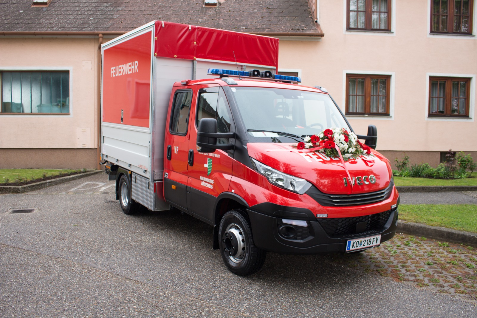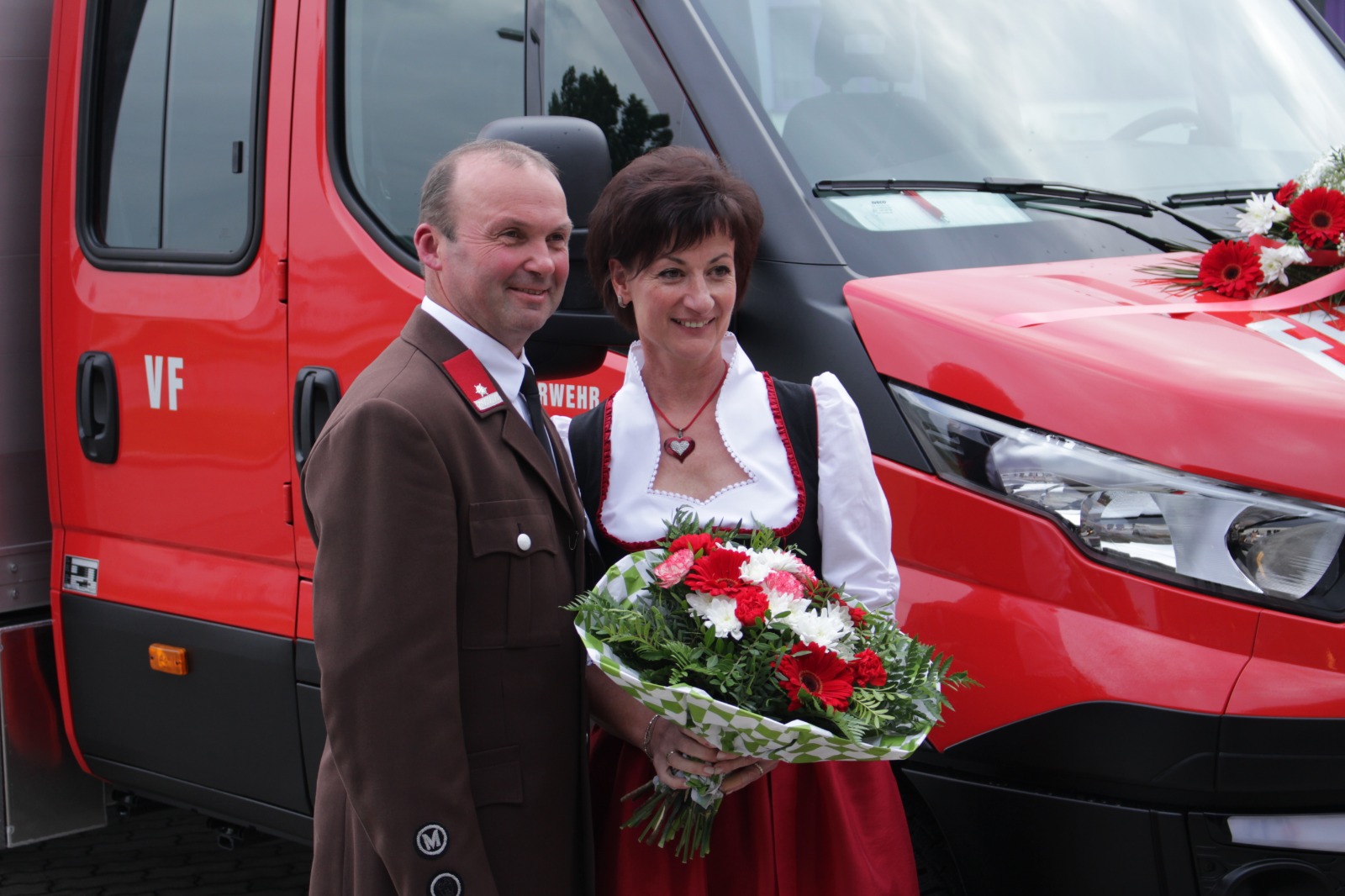 Gegenüber der ursprünglichen Planung wurde die hl. Messe aufgrund der Witterung von der Pfarrkirche Harmannsdorf in das Feuerwehrhaus verlegt. Vor der hl. Messe, wurde die Fahrzeugpatin, Frau Brigitte Hirsch, von unserem Feuerwehrkommando mit dem neuen Fahrzeug von zu Hause abgeholt. An dieser Stelle bedankt sich die Freiwillige Feuerwehr Harmannsdorf nochmals recht herzlich für die Übernahme der Patenschaft. Darüber hinaus bedankt sich die Freiwillige Feuerwehr Harmannsdorf-Rückersdorf auch noch bei allen Unterstützerinnen und Unterstützern, welche die Anschaffung des neuen Fahrzeuges überhaupt erst möglich gemacht haben.