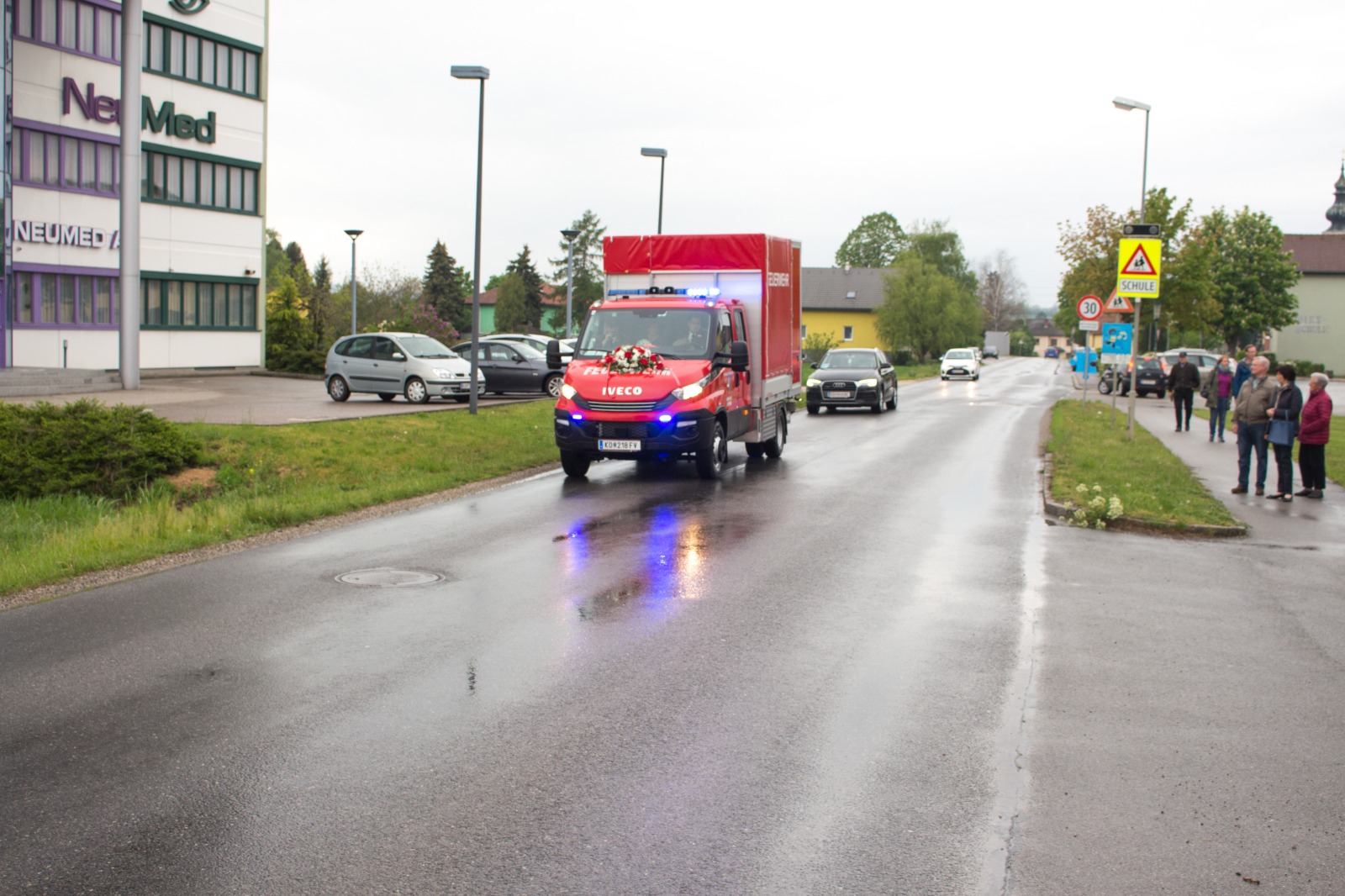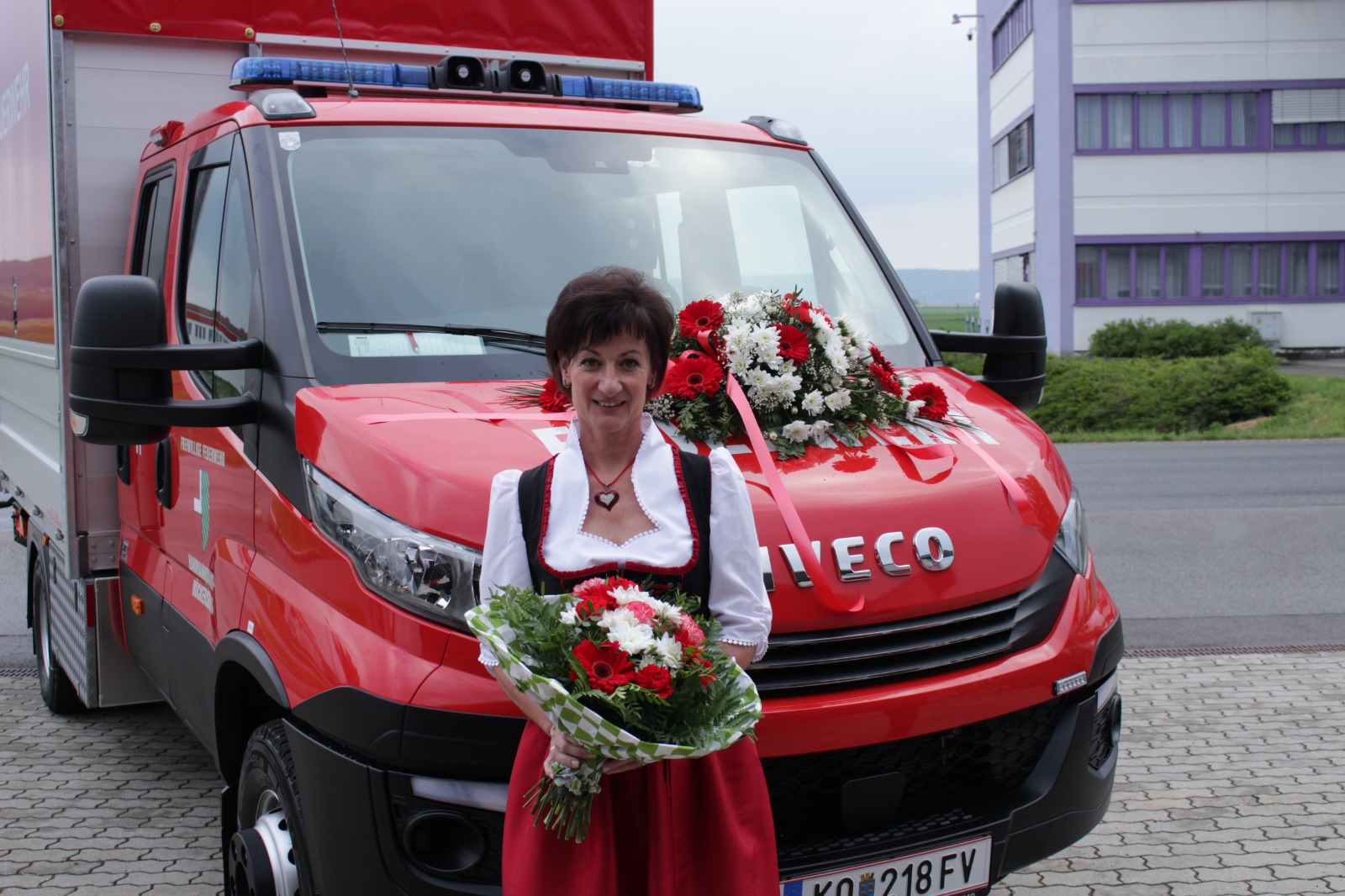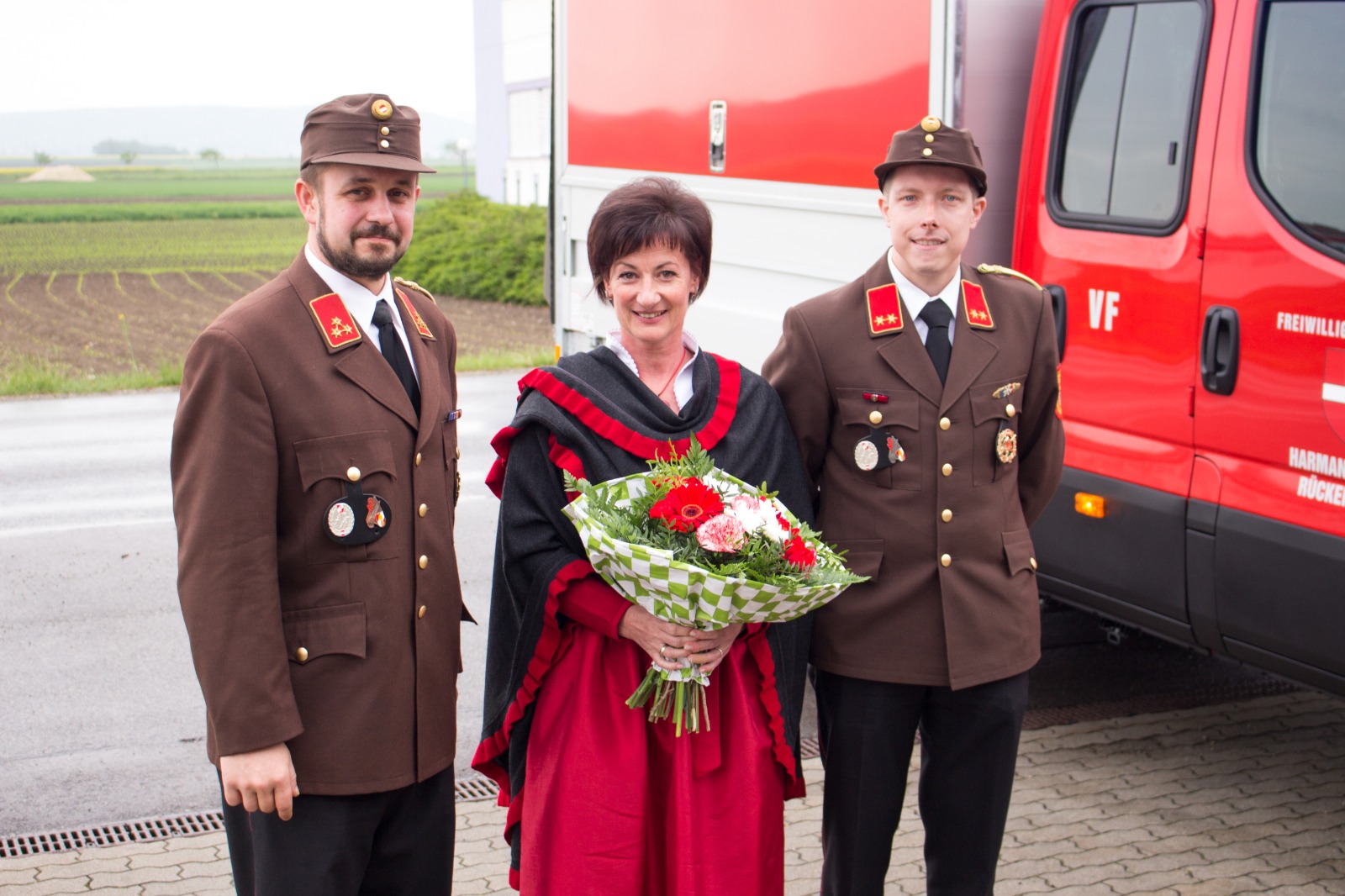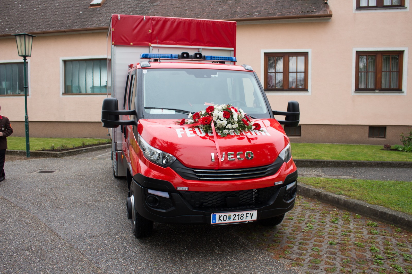 Gegenüber der ursprünglichen Planung wurde die hl. Messe aufgrund der Witterung von der Pfarrkirche Harmannsdorf in das Feuerwehrhaus verlegt. Vor der hl. Messe, wurde die Fahrzeugpatin, Frau Brigitte Hirsch, von unserem Feuerwehrkommando mit dem neuen Fahrzeug von zu Hause abgeholt. An dieser Stelle bedankt sich die Freiwillige Feuerwehr Harmannsdorf nochmals recht herzlich für die Übernahme der Patenschaft. Darüber hinaus bedankt sich die Freiwillige Feuerwehr Harmannsdorf-Rückersdorf auch noch bei allen Unterstützerinnen und Unterstützern, welche die Anschaffung des neuen Fahrzeuges überhaupt erst möglich gemacht haben.