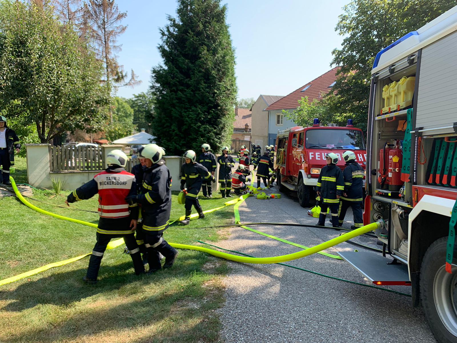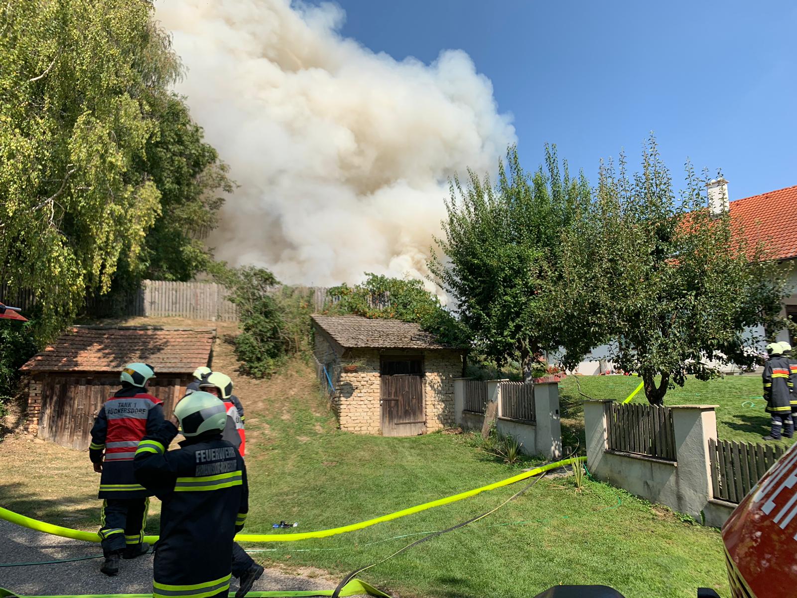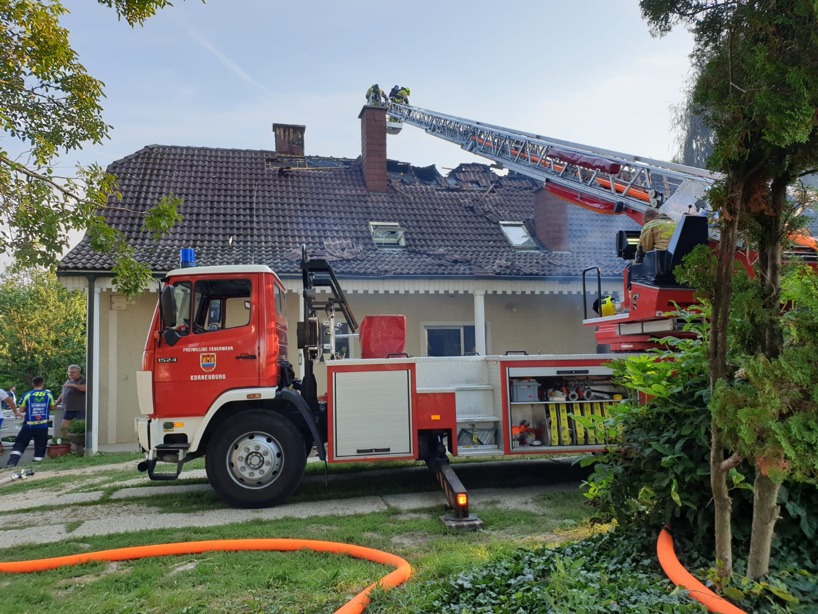 Zusammen mit den anderen Feuerwehren wurde gegen den Brand angekämpft. Während des Einsatzes wurde die Stufe von B3 auf B4 erhöht. Die Freiwillige Feuerwehr Korneuburg unterstützte mit dem Einsatz einer Drehleiter. Mit der Drehleiter wurde die Dachkonstruktion geöffnet, um den Schwellbrand im Dachstuhl zu bekämpfen. Weitere Glutnester konnten ebenfalls durch den Einsatz der Drehleiter von oben gezielt bekämpft werden. Um ca. 19:30 Uhr war der Brand größtenteils gelöscht. Vereinzelt schlugen noch Glutnester auf.