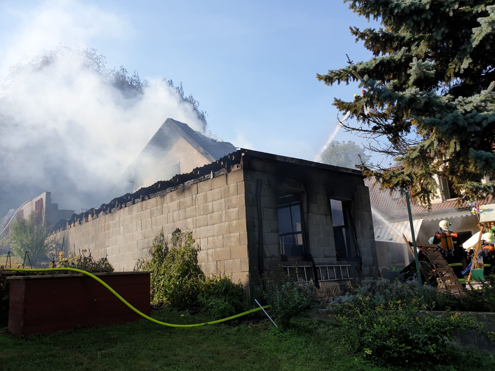 Nach Rücksprache mit dem Einsatzleiter vor Ort wurde umgehend mit der Herstellung mehrerer Löschleitungen begonnen und Atemschutztrupps rüsteten sich umgehend aus, um mit Außenangriffen von mehreren Seiten den Brand zu bekämpfen. Neben der Werkstatt, bei welcher der Brand vermutlich ausging, griffen die Flammen auch auf den Dachstuhl des angrenzenden Wohnhauses über. Darüber hinaus stand auch ein Auto unmittelbar vom Gebäude entfernt bereits in Brand. Dieser Brand wurde mittels Schaums bekämpft.