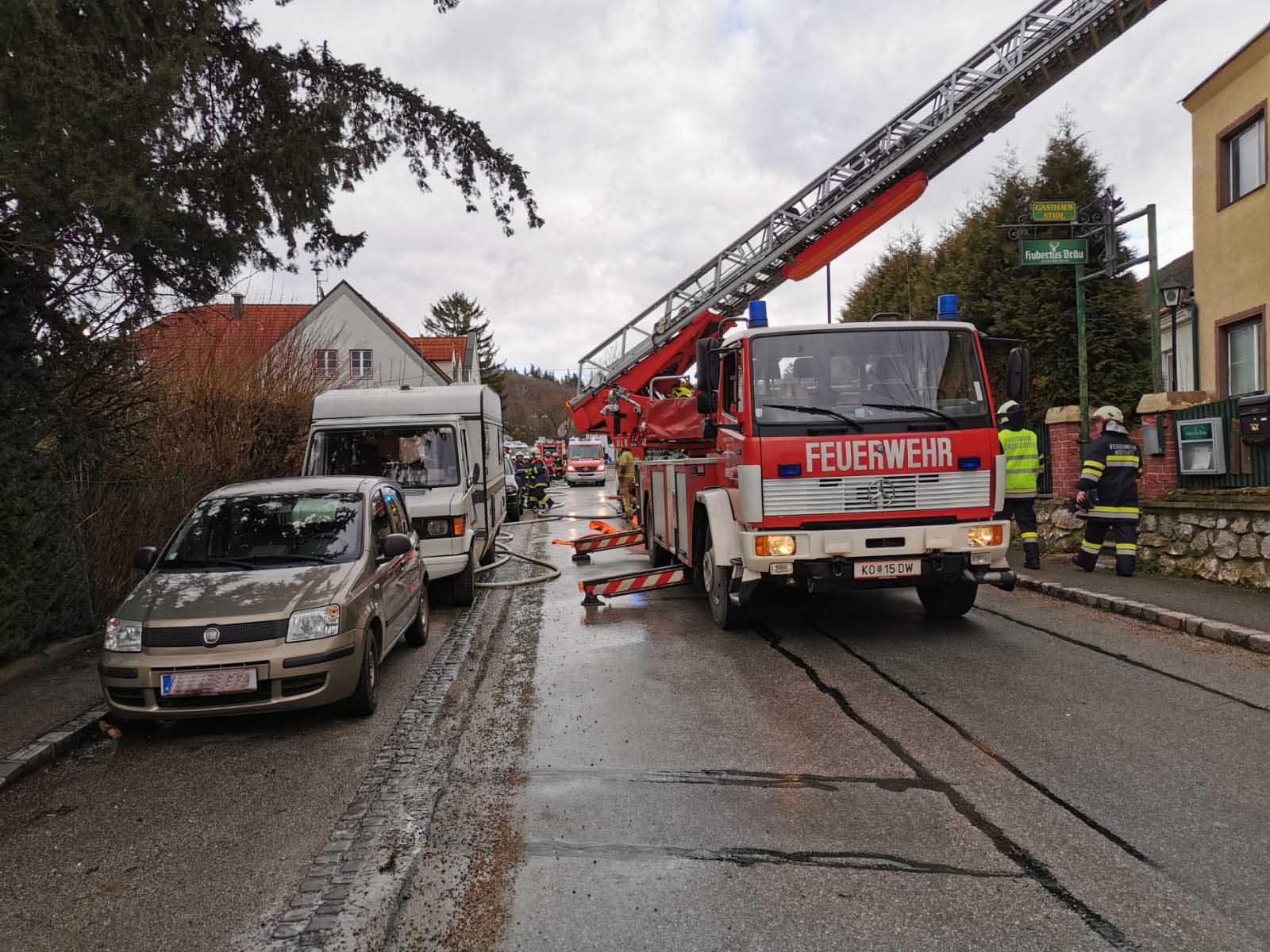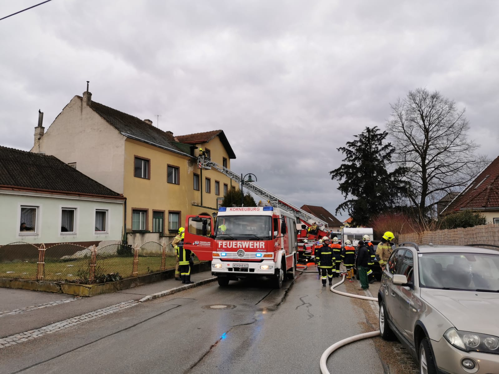 Am Einsatzort angekommen unterstützen wir die bereits vor Ort anwesenden Feuerwehren bei den Löscharbeiten. Um das Feuer optimal bekämpfen zu können, wurde die Drehleiter der Freiwilligen Feuerwehr der Stadt Korneuburg angefordert.