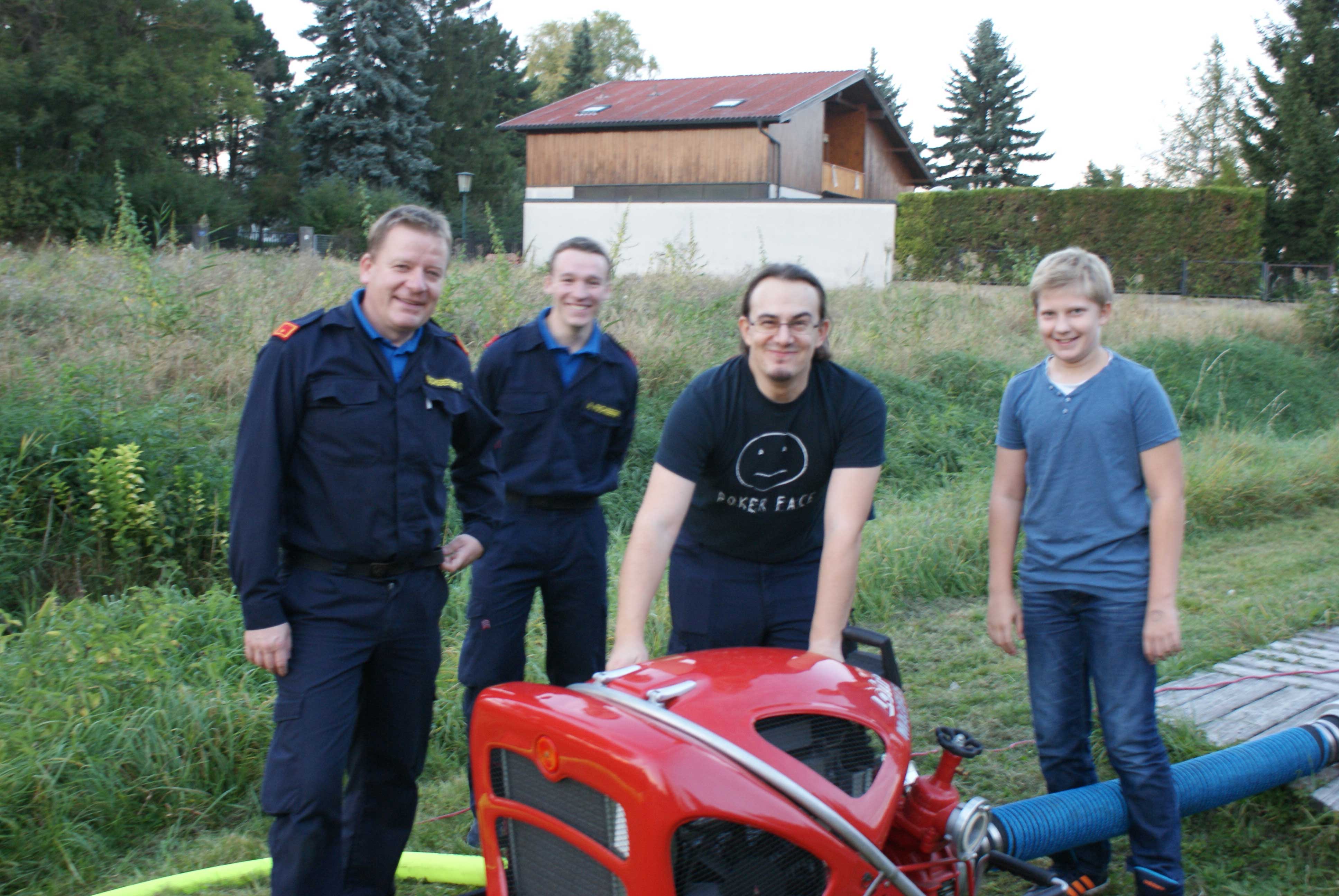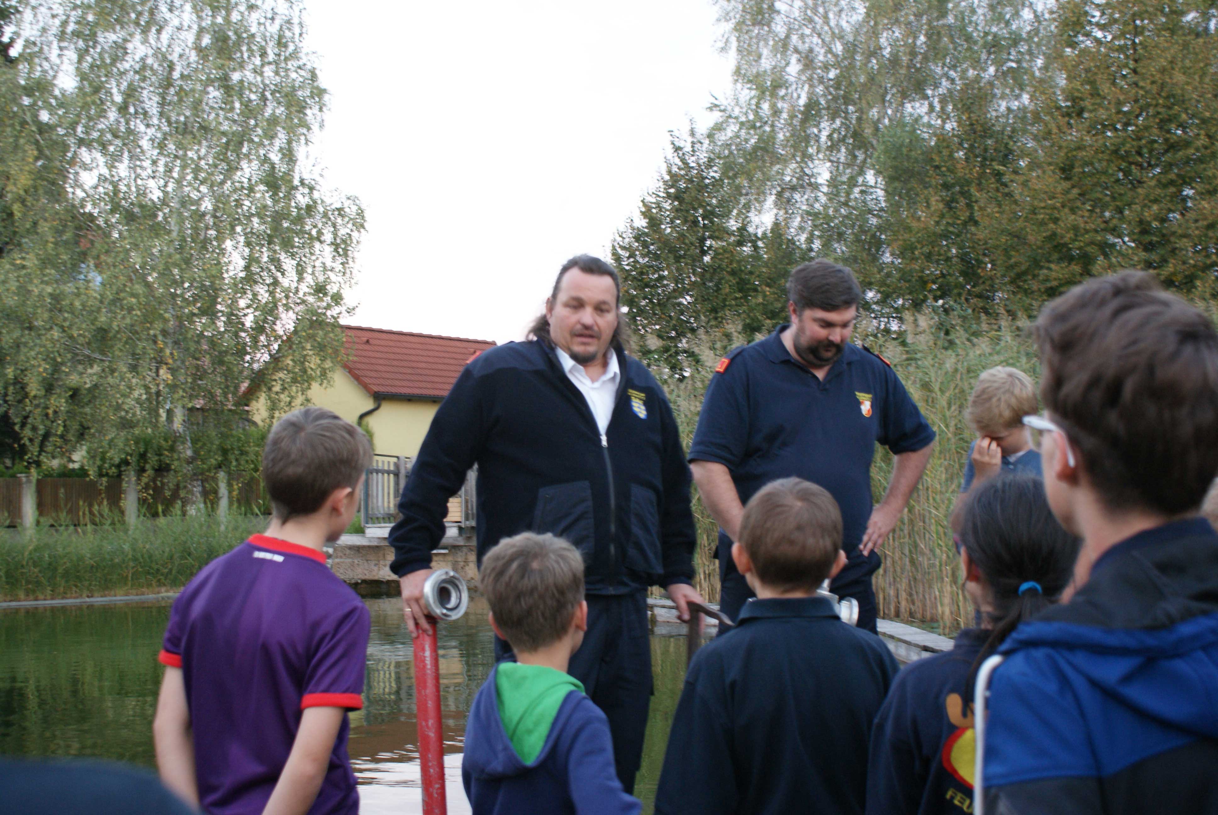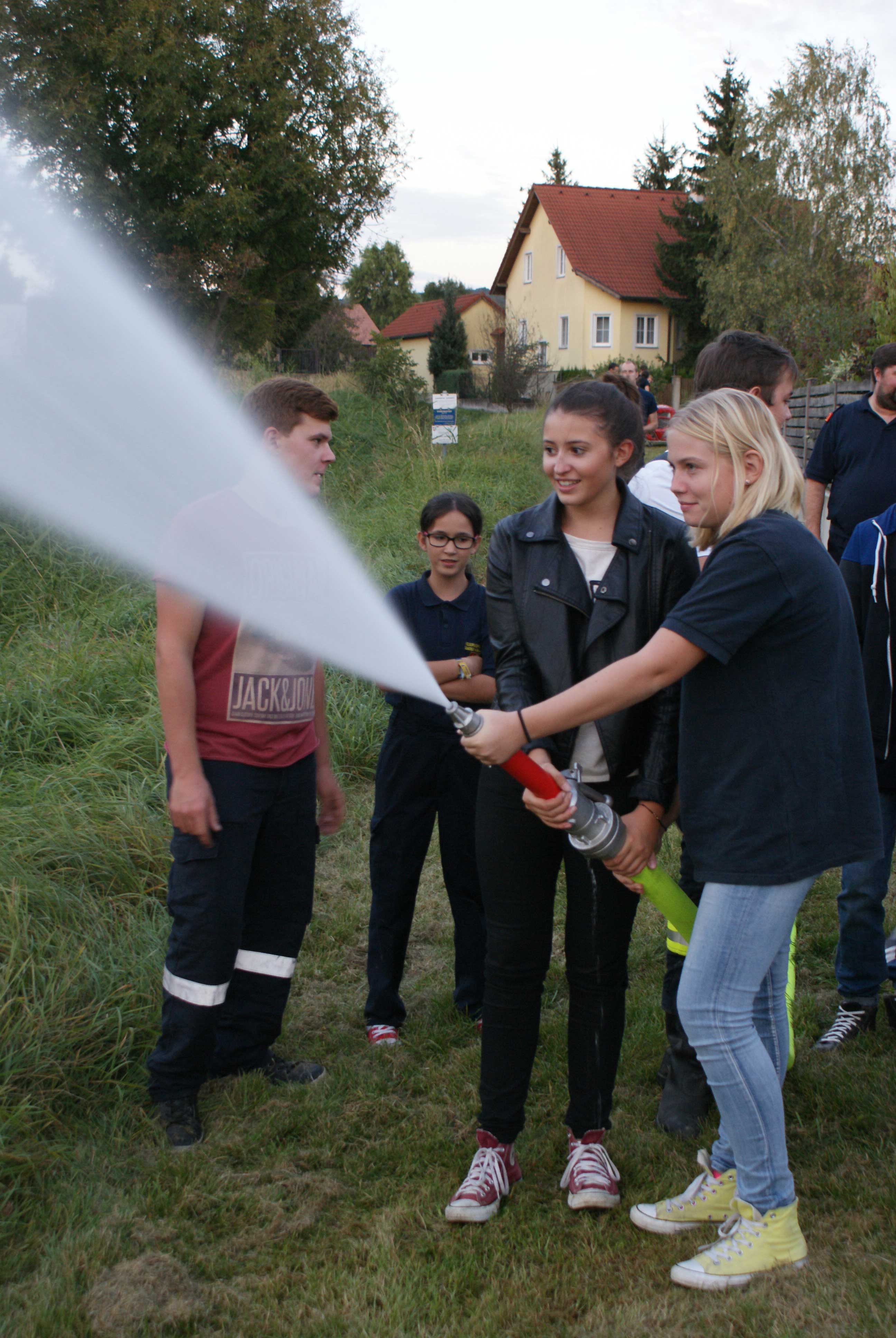 Bei der praktischen Umsetzung wurde mittels Tragkraftspritze (TS) über eine von den Kindern erstellte Saugleitung, bestehend aus 4 Saugern, im Teich angesaugt. Der „Angriff“ erfolgte anschließend mittels aufgebauter Löschleitung mit einem C-Mehrzweckstrahlrohr. Die Kinder konnten abwechselnd zu zweit mit Unterstützung der Feuerwehrjugendbetreuer das Strahlrohr bedienen.