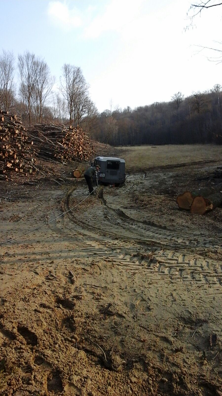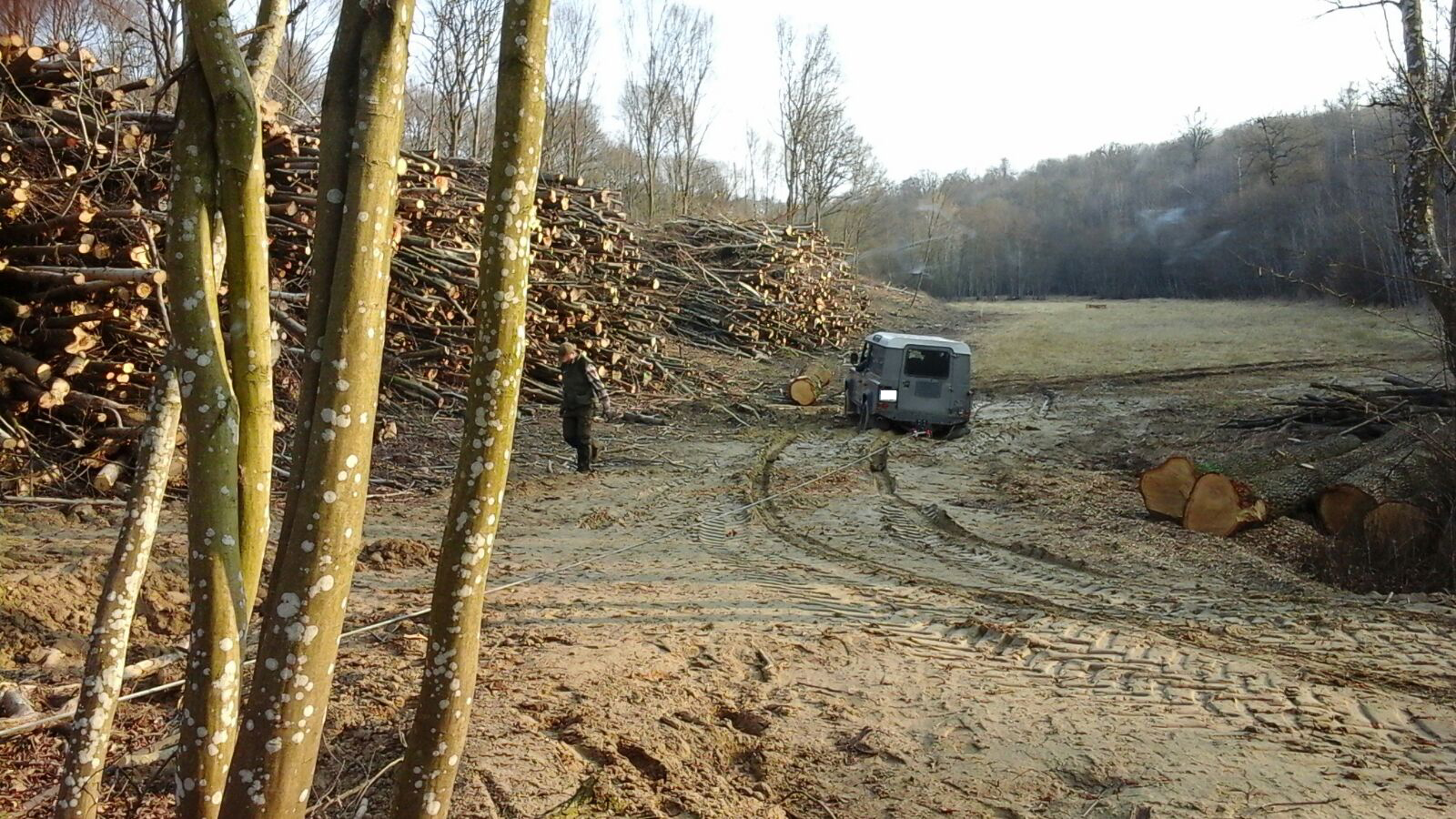 Ein Fahrzeuglenker blieb mit seinem Fahrzeug im aufgeweichten Boden stecken. Das Fahrzeug wurde mittels der Seilwinde des HLFA3 auf befestigten Boden zurück gezogen.