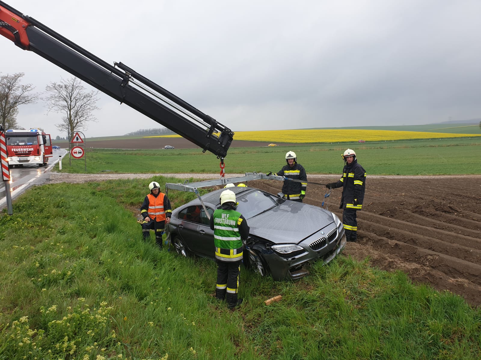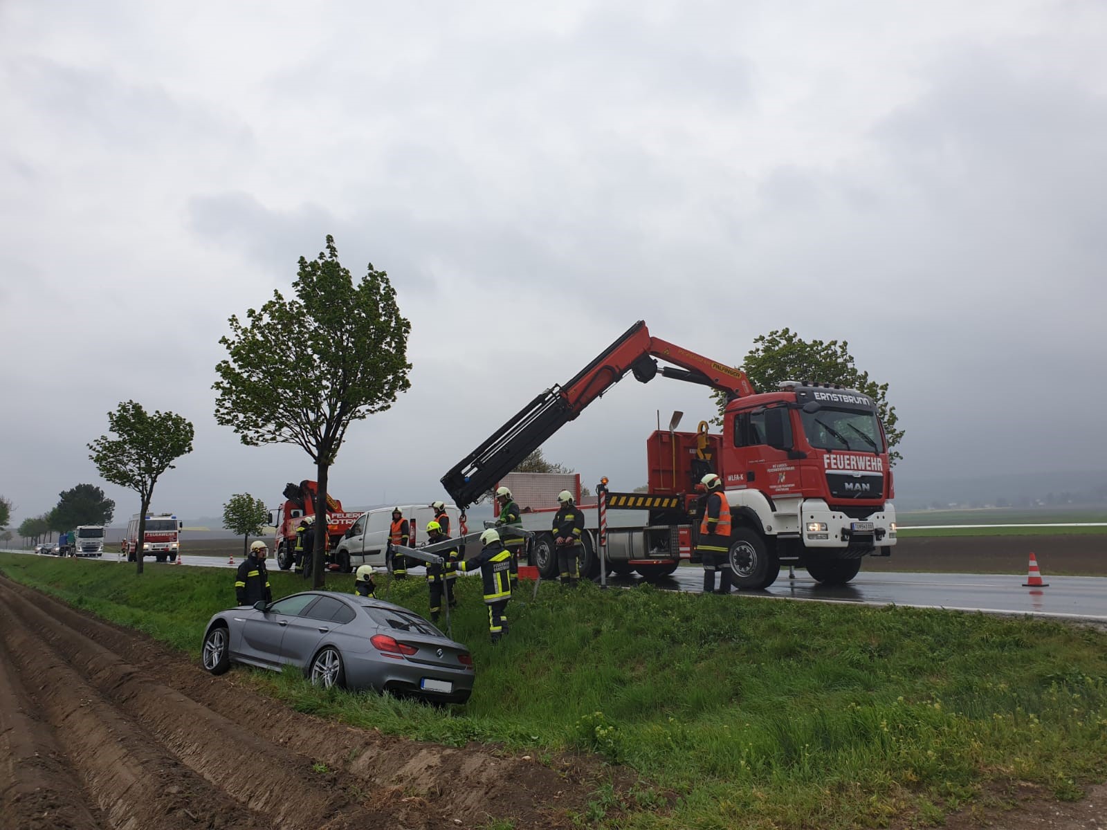 Zwei Fahrzeuge sind bei einem Überholvorgang zusammen gestoßen. Verletzt wurde dabei niemand. Unsere Aufgabe war es die Unfallstelle abzusichern und den weißen PKW von der Fahrbahn zu entfernen. Das zweite Fahrzeug wurde von der Feuerwehr Ernstbrunn mit dem Wechselladerfahrzeug mittels Ladekran aus dem Graben gehoben.