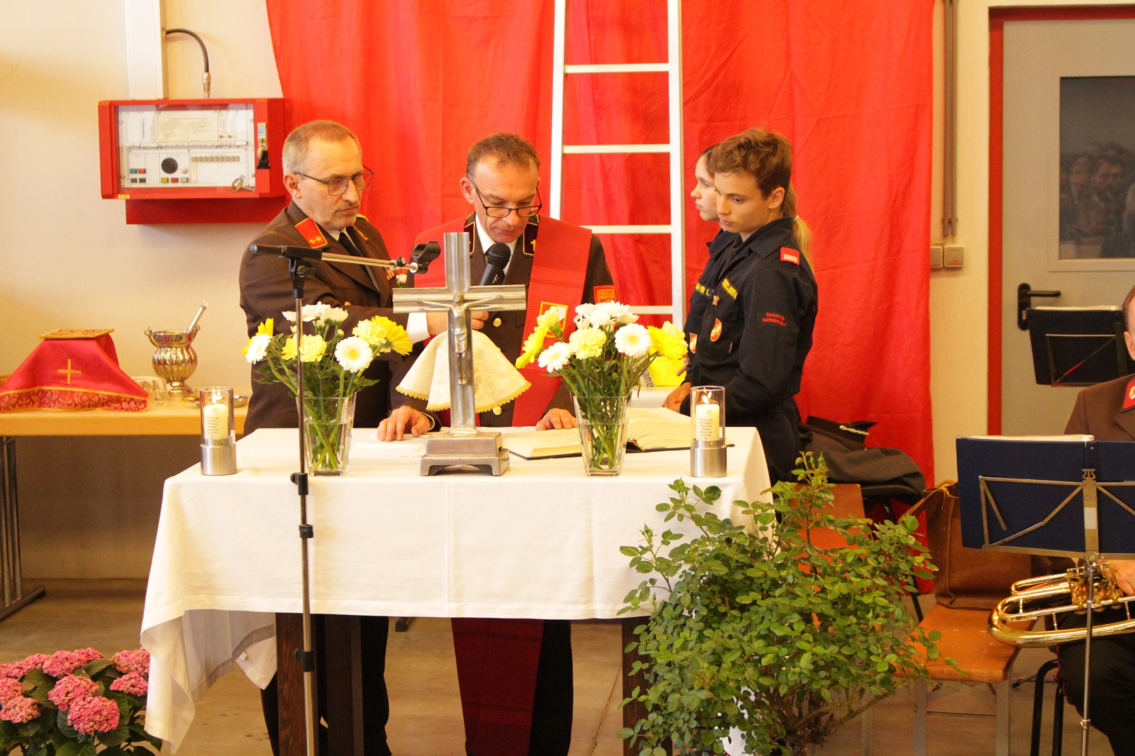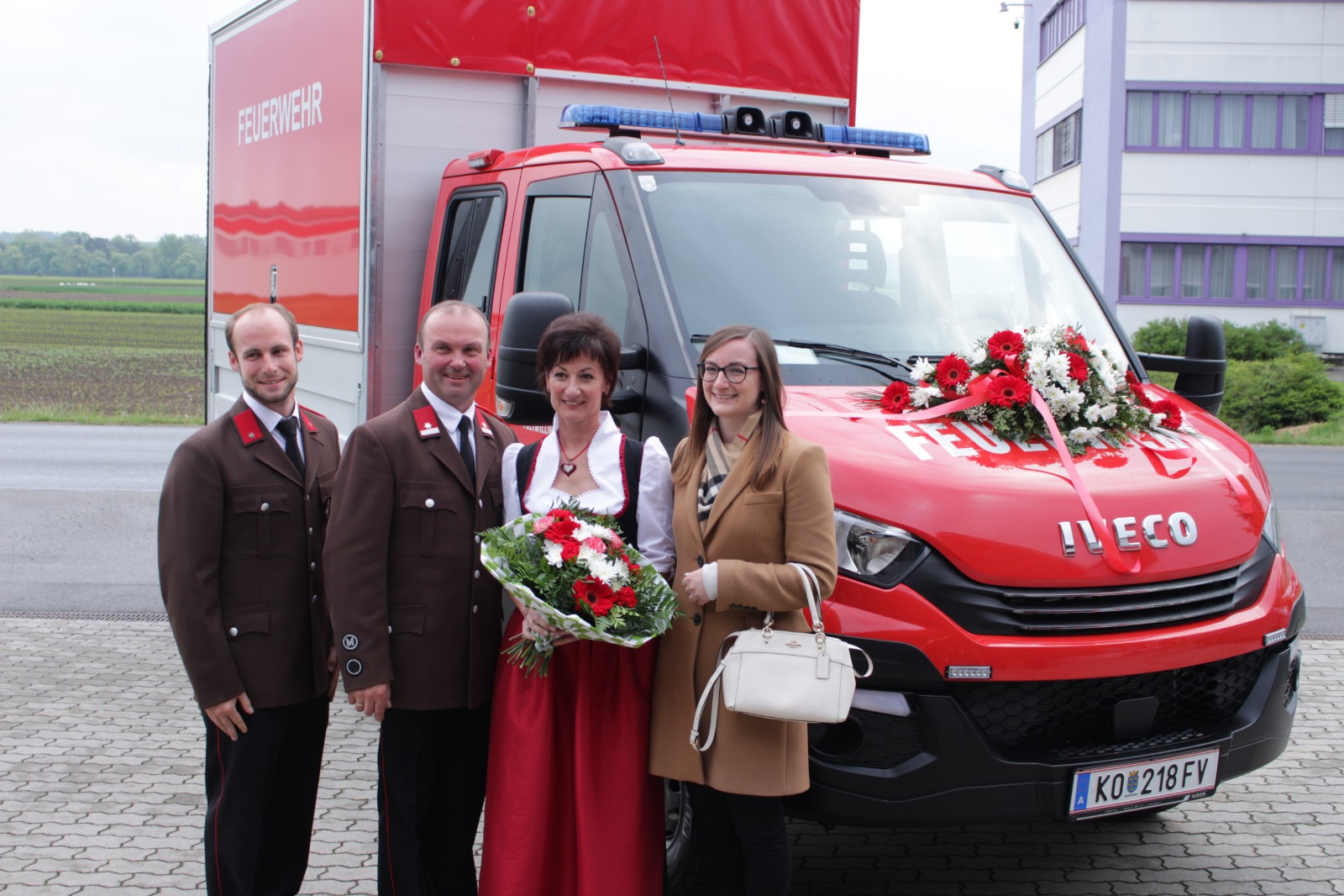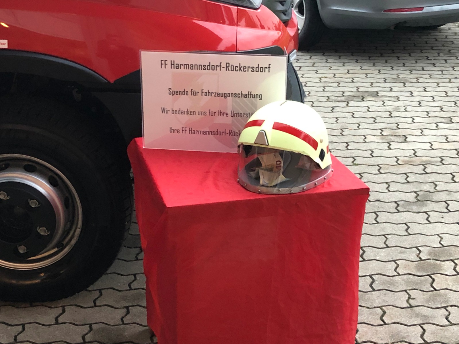 Gegenüber der ursprünglichen Planung wurde die hl. Messe aufgrund der Witterung von der Pfarrkirche Harmannsdorf in das Feuerwehrhaus verlegt. Vor der hl. Messe, wurde die Fahrzeugpatin, Frau Brigitte Hirsch, von unserem Feuerwehrkommando mit dem neuen Fahrzeug von zu Hause abgeholt. An dieser Stelle bedankt sich die Freiwillige Feuerwehr Harmannsdorf nochmals recht herzlich für die Übernahme der Patenschaft. Darüber hinaus bedankt sich die Freiwillige Feuerwehr Harmannsdorf-Rückersdorf auch noch bei allen Unterstützerinnen und Unterstützern, welche die Anschaffung des neuen Fahrzeuges überhaupt erst möglich gemacht haben.